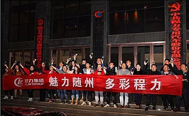 大概八點半的時候,CLW初見雛形,大家都進自己的車內試燈光和雙閃,希望在航拍的時候出現最佳效果。屏上顯示,這個C呢有點小,把弧度再稍微調大一點,還差一輛呢,這時,程總給了我們最大的支持,調動了自己的瑪莎拉蒂來壓軸,非誠勿擾的音樂想起,大BOSS在最后出場了。 一切準備就緒,關廣場燈、車燈,一切恢復到夜的靜謐。隨著航拍指揮楊總的口令,大家逐一打開車燈、雙閃燈,23臺車主的齊心在此刻彰顯更明,也照亮了此時的夜。9點楊總表示航拍取景結束,大家下車在辦公樓前排好隊拉開橫幅,喊出了此次的活動口號:天王蓋地虎,程力最威武,確認過眼神,都是程力人,哄亮的吶喊喊出了大家熱愛生活的心聲,也預示著此次活動驚艷的前奏已奏響。 我們程力人用最特殊的方式打響了新時代-互聯網新生代抖音APP展現自我的頭炮,后期各色的show time都會一一登場,讓我們拭目以待。 此次活動特別感謝湖北程力集團公司高層及各員工的支持,還有自媒體大咖----隨州虎福瑞食品公司總經理楊歡、隨州抖音俱樂部會長胡夢圓女士的友情相助和鼎力支持。