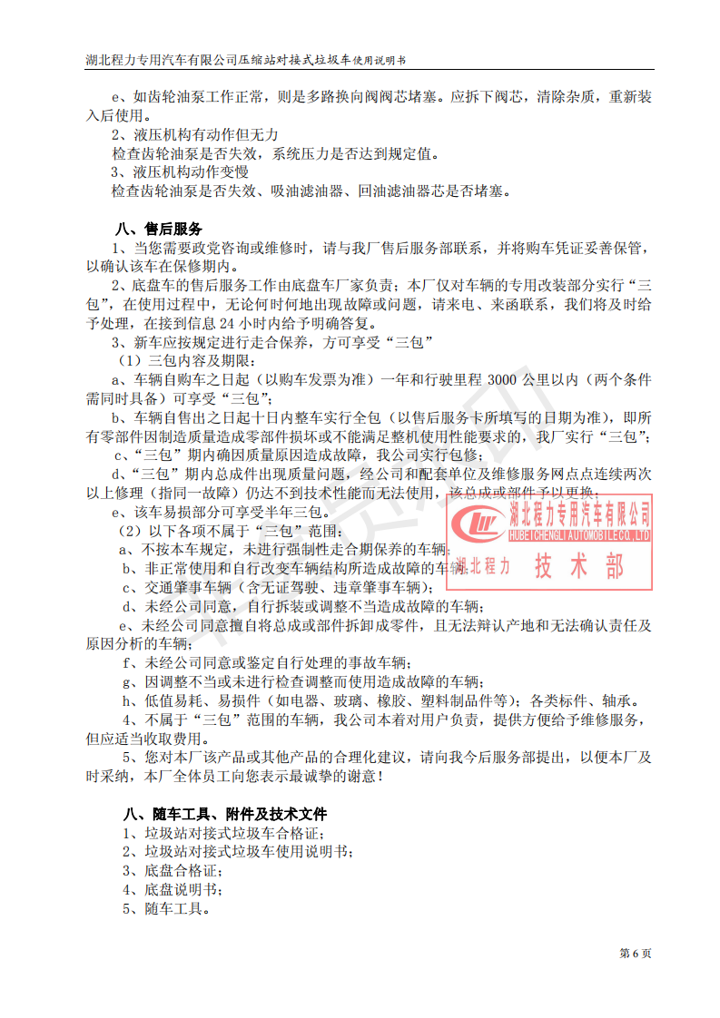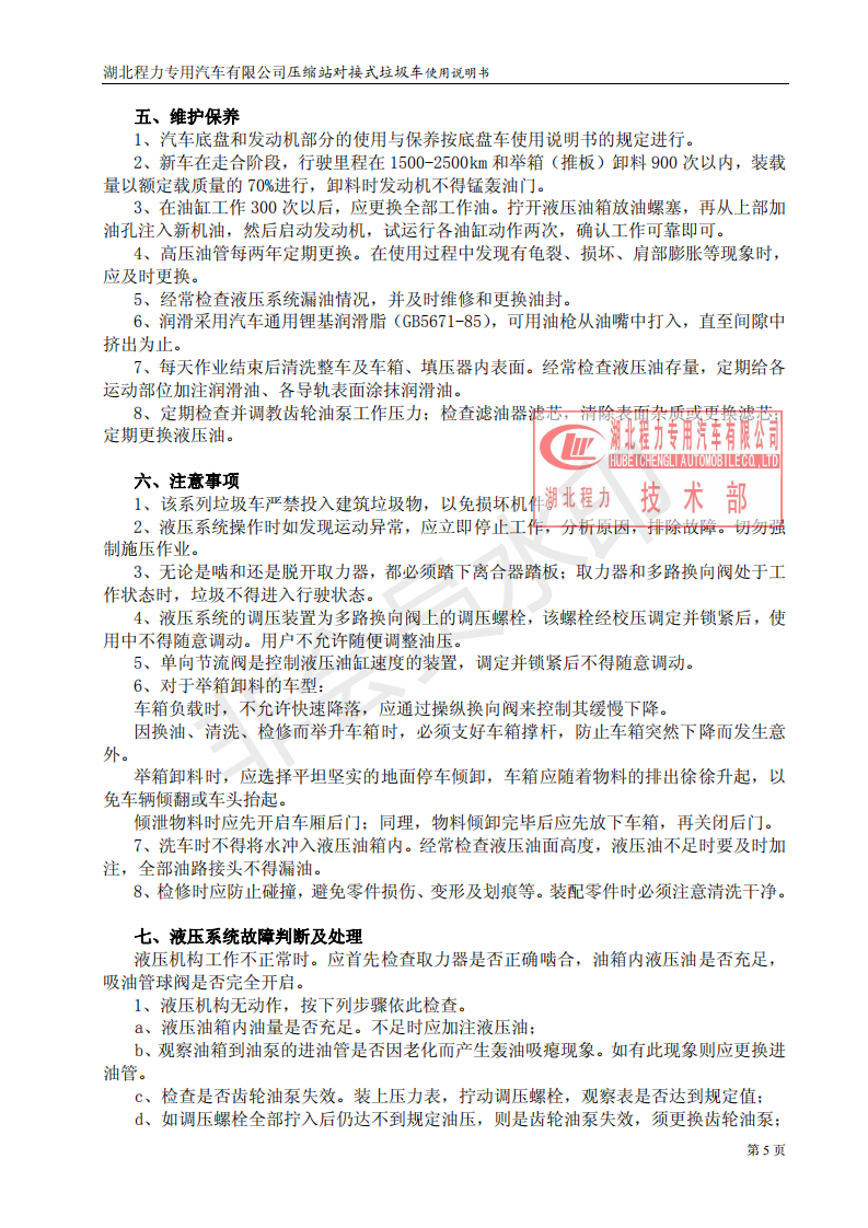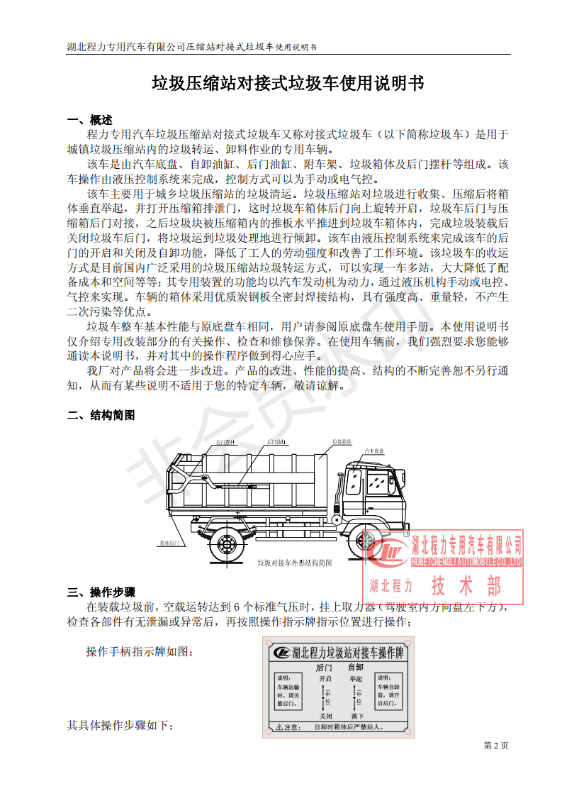 湖北程力垃圾壓縮站對(duì)接式垃圾車使用操作說(shuō)明書